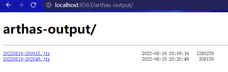 默认情况下,arthas 使用 8563 端口,则可以打开: http://localhost:8563/arthas-output/在新窗口打开 查看到arthas-output目录下面的 JFR 记录结果: